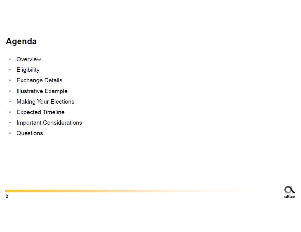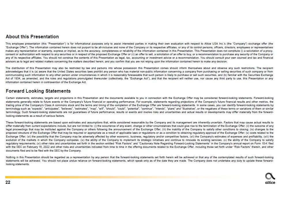 About this Presentation This employee presentation (this "Presentation") is for informational purposes only to assist interested parties in making their own evaluation with respect to Altice USA Inc.'s (the "Company") exchange offer (the "Exchange Offer"). The information contained herein does not purport to be all-inclusive and none of the Company or its respective affiliates, or any of its control persons, officers, directors, employees or representatives makes any representation or warranty, express or implied, as to the accuracy, completeness or reliability of the information contained in this Presentation. This Presentation does not constitute (i) a solicitation of a proxy, consent or authorization with respect to any securities or in respect of the proposed Exchange Offer or (ii) an offer to sell, a solicitation of an offer to buy, or a recommendation to purchase any security of the Company or any of its respective affiliates. You should not construe the contents of this Presentation as legal, tax, accounting or investment advice or a recommendation. You should consult your own counsel and tax and financial advisors as to legal and related matters concerning the matters described herein, and you confirm that you are not relying upon the information contained herein to make any decision. The distribution of this Presentation may also be restricted by law and persons into whose possession this Presentation comes should inform themselves about and observe any such restrictions. The recipient acknowledges that it is (a) aware that the United States securities laws prohibit any person who has material non-public information concerning a company from purchasing or selling securities of such company or from communicating such information to any other person under circumstances in which it is reasonably foreseeable that such person is likely to purchase or sell such securities, and (b) familiar with the Securities Exchange Act of 1934, as amended, and the rules and regulations promulgated thereunder (collectively, the "Exchange Act"), and that the recipient will neither use, nor cause any third party to use, this Presentation or any information contained herein in contravention of the Exchange Act. Forward Looking Statements Certain statements, estimates, targets and projections in this Presentation and the documents available to you in connection with the Exchange Offer may be considered forward-looking statements. Forward-looking statements generally relate to future events or the Company's future financial or operating performance. For example, statements regarding projections of the Company's future financial results and other metrics, the trading price of the Company's Class A commons stock and the terms and timing of the completion of the Exchange Offer are forward-looking statements. In some cases, you can identify forward-looking statements by terminology such as "expects", "anticipates", "believes", "estimates", "may", "will", "should", "could", "potential", "continue", "intends", "plans" and "illustrative", or the negatives of these terms or variations of them or similar terminology. Such forward-looking statements are not guarantees of future performance, results or events and involve risks and uncertainties and actual results or developments may differ materially from the forward-looking statements as a result of various factors. These forward-looking statements are based upon estimates and assumptions that, while considered reasonable by the Company and its management are inherently uncertain. Factors that may cause actual results to differ materially from current expectations include, but are not limited to: (i) the occurrence of any event, change or other circumstances that could give rise to the termination of the Exchange Offer; (ii) the outcome of any legal proceedings that may be instituted against the Company or others following the announcement of the Exchange Offer; (iii) the inability of the Company to satisfy other conditions to closing; (iv) changes to the proposed structure of the Exchange Offer that may be required or appropriate as a result of applicable laws or regulations or as a condition to obtaining regulatory approval of the Exchange Offer; (v) costs related to the Exchange Offer; (vi) the possibility that the Company may be adversely affected by other economic, business, regulatory and/or competitive factors, (vii) the Company's estimates of expenses and profitability, (viii) the evolution of the markets in which the Company competes; (ix) the ability of the Company to implement its strategic initiatives and continue to innovate its existing services; (x) the ability of the Company to satisfy regulatory requirements; (xi) other risks and uncertainties set forth in the section entitled "Risk Factors" and "Cautionary Note Regarding Forward-Looking Statements" in the Company's annual report on Form 10-K filed with the SEC on February 16, 2022 and other risks and uncertainties indicated from time to time in the offering documents related to the Exchange Offer, including those set forth under "Risk Factors" therein, and other documents filed and to be filed with the SEC by the Company. Nothing in this Presentation should be regarded as a representation by any person that the forward-looking statements set forth herein will be achieved or that any of the contemplated results of such forward-looking statements will be achieved. You should not place undue reliance on forward-looking statements, which speak only as of the date they are made. The Company does not undertake any duty to update these forward-looking statements. 22