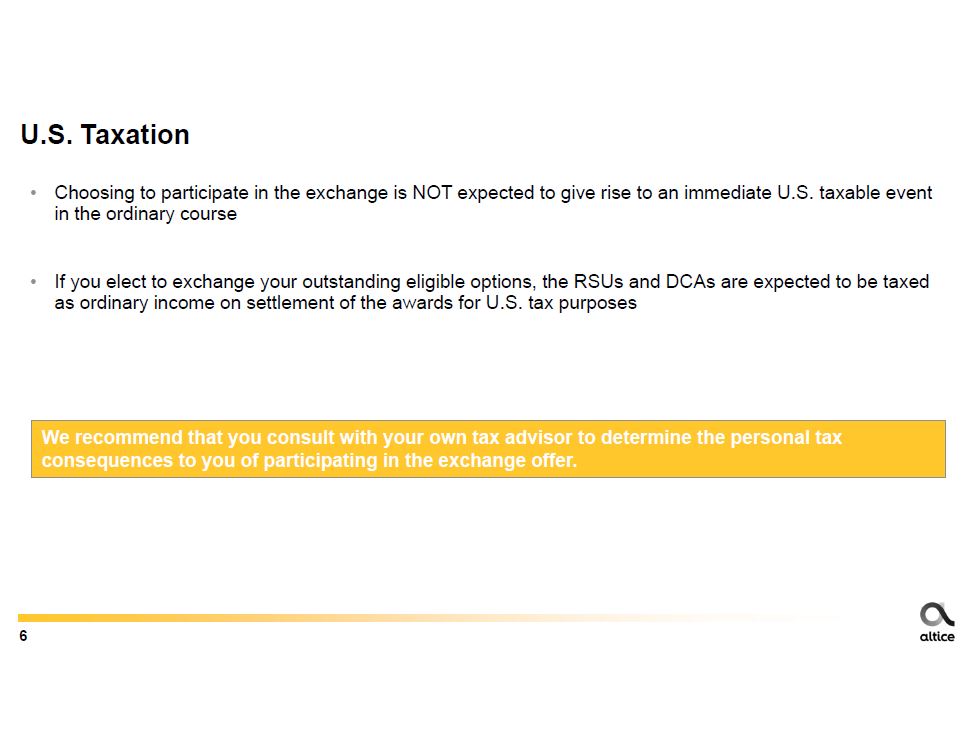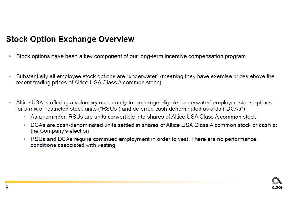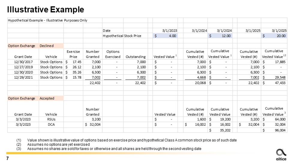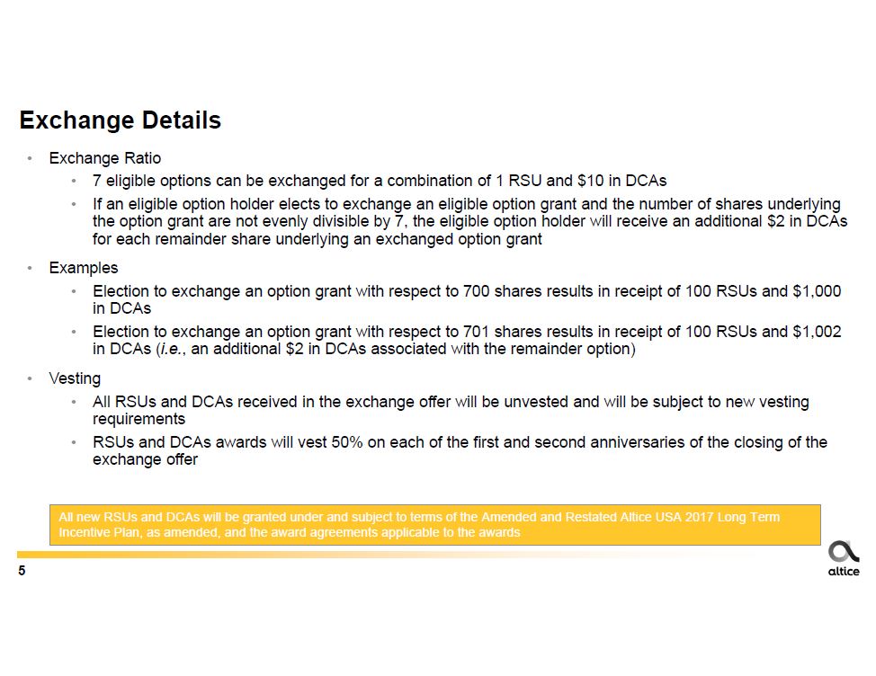 Exchange Details Exchange Ratio 7 eligible options can be exchanged for a combination of 1 RSU and $10 in DCAs If an eligible option holder elects to exchange an eligible option grant and the number of shares underlying the option grant are not evenly divisible by 7, the eligible option holder will receive an additional $2 in DCAs for each remainder share underlying an exchanged option grant Examples Election to exchange an option grant with respect to 700 shares results in receipt of 100 RSUs and $1,000 in DCAs Election to exchange an option grant with respect to 701 shares results in receipt of 100 RSUs and $1,002 in DCAs (i.e., an additional $2 in DCAs associated with the remainder option) Vesting All RSUs and DCAs received in the exchange offer will be unvested and will be subject to new vesting requirements RSUs and DCAs awards will vest 50% on each of the first and second anniversaries of the closing of the exchange offer All new RSUs and DCAs will be granted under and subject to terms of the Amended and Restated Altice USA 2017 Long Term Incentive Plan, as amended, and the award agreements applicable to the awards 5
