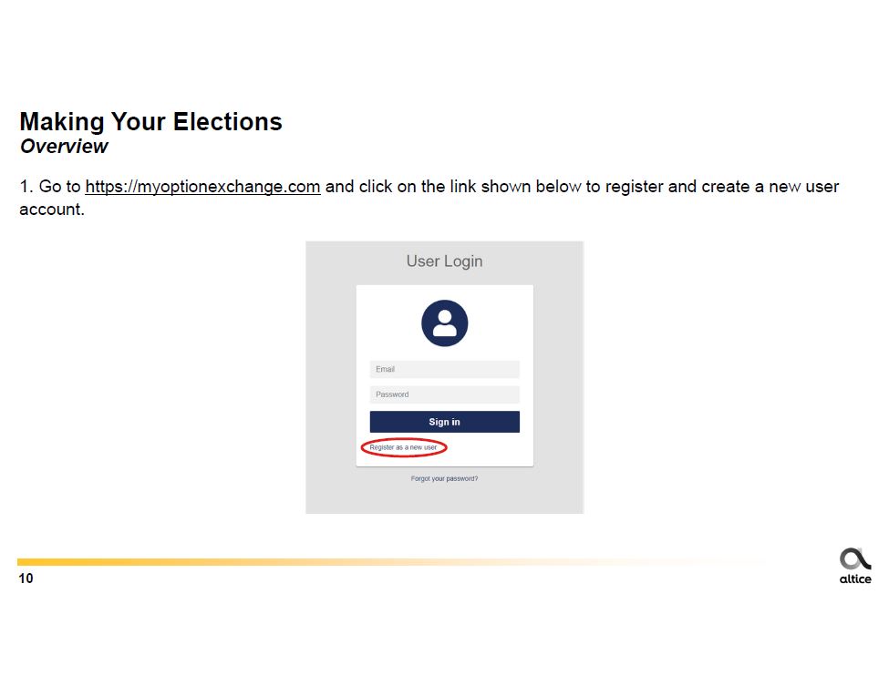 Making Your Elections Overview Your elections must be made through the exchange offer website: https://myoptionexchange.com You will be able to do the following: View offering materials, including the offering's terms and conditions and QandAs Elect to exchange eligible options on a grant-by-grant basis (must exchange entire grant) View the number of RSUs and DCAs that may be granted in exchange for each option grant View the value of your options and any RSUs or DCAs that may be granted in exchange for your options at hypothetical future stock prices You will receive a confirmation of your elections upon completion You can change your election at anytime during the offering period Once the exchange offer has closed, only the final election will be considered Options tendered for exchange in the exchange offer will be cancelled at 5:00 PM ET on March 1, 2023, and RSUs and DCAs granted in exchange for tendered options will be granted promptly thereafter Your final elections must be received prior to the expiration of the exchange offer, which is March 1, 2023, at 5:00 pm Eastern Time (unless extended by Altice USA). 9
