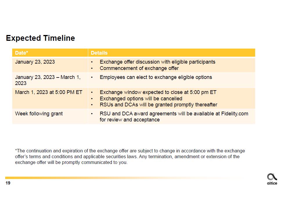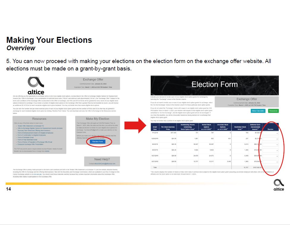 Making Your Elections Overview 5. You can now proceed with making your elections on the election form on the exchange offer website. All elections must be made on a grant-by-grant basis. Exchange Offer Commencement Date: January 23, 2023 Expiration Time: March 1, 2023 at 5:00 PM Eastern Time We are offering you the opportunity to exchange some or all of your eligible stock options, as described in the Offer to Exchange Eligible Options for Replacement Awards (the "Offer to Exchange"), for a combination of restricted stock units ("RSUs") and deferred cash-denominated ("DCAs"), the "Exchange Offer." Subject to the terms and conditions of the Exchange Offer as described in the Offer to Exchange, one RSU and $10 of DCAs will be granted for every seven of your eligible stock options tendered for exchange. If you tender a number of eligible stock options in the Exchange Offer that is greater than but not divisible by seven, you will receive an additional $2 of DCAs for each remainder eligible stock option tendered. You may not tender less than seven eligible stock options. You can view the number and per share exercise price of each of your eligible stock option grants and the number of RSUs and DCAs that may be granted in exchange for each tendered eligible stock option by clicking "Election Form" below. You can download and view the Offer to Exchange in the Resources section below. Resources Click on any of the links below to learn more. Tender Offer Statement on Schedule TO Offer to Exchange Eligible Options for Replacement Awards (includes Summary Term Sheet and Offering Memorandum) Form of Announcement Email to All Eligible Employees Form of Confirmation to Eligible Employees Form of Reminder Email Form of Final Reminder Email Form of Notice of Expiration of Exchange Offer Email Employee Exchange Offer Presentation The PDF documents above require Adobe Acrobat Reader. Adobe Acrobat Reader can be downloaded free of charge from Adobe. Make My Election The Exchange Offer will expire at 5:00 PM Eastern Time on March 1 2023. After this date and this time, you will not be able to make an election to tender for your eligible stock options for exchange. You have 47 days left to make your election on the Election Form. Before you make your election, you should carefully read the offering materials in the Resources section. Election Form Need Help? Contact AlticeUSAComp@alticeusa.com The Exchange Offer is being made pursuant to the terms and conditions set forth in the Tender Offer Statement on Schedule TO and the exhibits attached thereto, including the Offer to Exchange and the Offering Memorandum, filed with the Securities and Exchange Commission, which are available to you free of charge on this Option Exchange website or at www.sec.gov. You should read these materials carefully because they contain important information about the Exchange Offer, including risks related to participation in the Exchange Offer. Election Form Indicate your decision to tender each of your eligible stock option grants for exchange by selecting the "Exchange" choice in the Election column. If you do not want to tender one or more of your eligible stock option grants for exchange, select the "Do Not Exchange" choice in the Election column for those particular stock option grants. If you do not select the "Exchange" choice with respect to an eligible stock option grant by 5:00 PM Eastern Time on March 1, 2023, your election with respect to that eligible stock option grant will default to "Do Not Exchange", and the eligible stock option grant will not be exchanged. If you miss this deadline, you will be irrevocably treated as having elected not to exchange that eligible stock option grant. You may not tender only a portion of an eligible stock option grant. Exchange Offer Commencement Date: January 23, 2023 Expiration Time: March 1, 2023 at 5:00 PM Eastern Time Value Calculator Resources Grant Date Per Share Exercise Price Outstanding Shares Underlying Stock Option Grant* Vested Stock Options as of 3/1/2023** Unvested Stock Options as of 3/1/2023** Restricted Stock Units*** Deferred Cash-Denominated Awards*** Election 1/1/2018 $17.445 701 701 0 100 $1,002.00 6/28/2019 $24.08 1,661 830 831 237 $2,374.00 8/2/2019 $25.45 39,297 39,297 0 5,613 $56,142.00 8/2/2019 $25.45 9,824 9,824 0 1,403 $14,036.00 9/27/2019 $29.08 24,075 24,075 0 3,439 $34,394.00 9/27/2019 $29.08 13,757 10,317 3,440 1,965 $19,654.00 Total 12,757 $127,602.00 *This column displays the number of shares of Altice USA Class A common stock subject to the eligible stock option grant (assuming you remain employed with Altice USA or its subsidiaries or affiliates and the stock option is not exercised, through March 1, 2023). 14