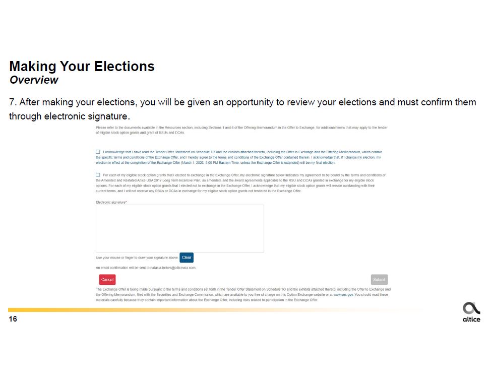 Making Your Elections Overview 7. After making your elections, you will be given an opportunity to review your elections and must confirm them through electronic signature. Please refer to the documents available in the Resources section, including Sections 1 and 6 of the Offering Memorandum in the Offer to Exchange, for additional terms that may apply to the tender of eligible stock option grants and grant of RSUs and DCAs. I acknowledge that I have read the Tender Offer Statement on Schedule TO and the exhibits attached thereto, including the Offer to Exchange and the Offering Memorandum, which contain the specific terms and conditions of the Exchange Offer, and I hereby agree to the terms and conditions of the Exchange Offer contained therein. I acknowledge that, if I change my election, my election in effect at the completion of the Exchange Offer (March 1, 2023, 5:00 PM Eastern Time, unless the Exchange Offer is extended) will be my final election. For each of my eligible stock option grants that I elected to exchange in the Exchange Offer, my electronic signature below indicates my agreement to be bound by the terms and conditions of the Amended and Restated Altice USA 2017 Long Term Incentive Plan, as amended, and the award agreements applicable to the RSU and DCAs granted in exchange for my eligible stock options. For each of my eligible stock option grants that I elected not to exchange in the Exchange Offer, I acknowledge that my eligible stock option grants will remain outstanding with their current terms, and I will not receive any RSUs or DCAs in exchange for my eligible stock option grants not tendered in the Exchange Offer. Electronic signature* Use your mouse or finger to draw your signature above. Clear An email confirmation will be sent to natasia.forbes@alticeusa.com. Cancel Submit The Exchange Offer is being made pursuant to the terms and conditions set forth in the Tender Offer Statement on Schedule TO and the exhibits attached thereto, including the Offer to Exchange and the Offering Memorandum, filed with the securities and Exchange Commission, which are available to you free of charge on this Option Exchange website or at www.sec.gov. You should read these materials carefully because they contain important information about the Exchange Offer, including risks related to participation in the Exchange Offer. 16