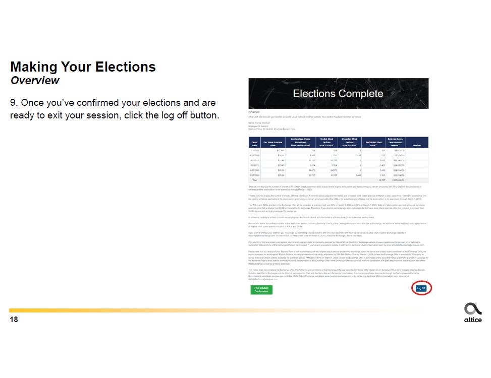 Making Your Elections Overview 8. Upon submitting your election, a confirmation statement will be generated by the exchange offer website. Please print and keep a copy of the confirmation statement for your records. An email confirmation will also be sent to your Altice USA email address. Elections Complete Finished Altice USA has received your election via Altice USA's Option Exchange website. Your election has been recorded as follows: Name: Rachel Wollman Employee ID: Admin2 Date and Time: 01/17/2023 10:36 AM Eastern Time Grant Date Per Share Exercise Price Outstanding Shares Underlying Stock Option Grant* Vested Stock Options as of 3/1/2023** Unvested Stock Options as of 3/1/2023** Restricted Stock Units*** Deferred Cash-Denominated Awards*** Election 1/1/2018 $17.445 701 701 0 100 $1,002.00 6/28/2019 $24.08 1,661 830 831 237 $2,374.00 8/2/2019 $25.45 39,297 39,297 0 5,613 $56,142.00 8/2/2019 $25.45 9,824 9,824 0 1,403 $14,036.00 9/27/2019 $29.08 24,075 24,075 0 3,439 $34,394.00 9/27/2019 $29.08 13,757 10,317 3,440 1,965 $19,654.00 Total 12,757 $127,602.00 17