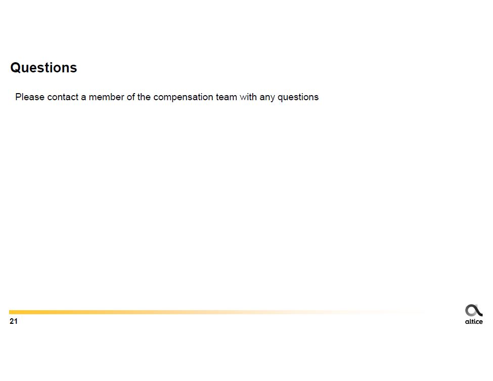 Important Considerations The terms governing the exchange offer will be set forth in tender offer documents (consisting of a Tender Offer Statement on Schedule TO and related exhibits thereto) to be filed with the SEC and available to you on the exchange offer website: https://myoptionexchange.com You should review the tender offer documents, including the "Risk Factors" section of the tender offer documents. Risks associated with participation in the exchange offer include: Vested options will be exchanged for unvested RSUs and unvested DCAs Extended vesting period may result in increased risk of forfeiture If your employment is terminated with Altice USA (other than as a result of death or disability) before the RSUs or DCAs received in the exchange offer vest, the unvested RSUs and DCAs will be cancelled, and you will receive no value from the unvested portion of the awards Participation does not guarantee continued or future employment with Altice USA or any of its affiliates A benefit or return cannot be guaranteed and participation in the exchange offer may result in no economic benefit You should consult with your personal financial and/or tax advisors to fully assess the benefits and risks involved in participating in the exchange offer Altice USA has not authorized anyone to make any recommendation on its behalf regarding participation in the exchange offer. Should a recommendation or representation be received, it should not be relied upon as having been authorized by Altice USA 20